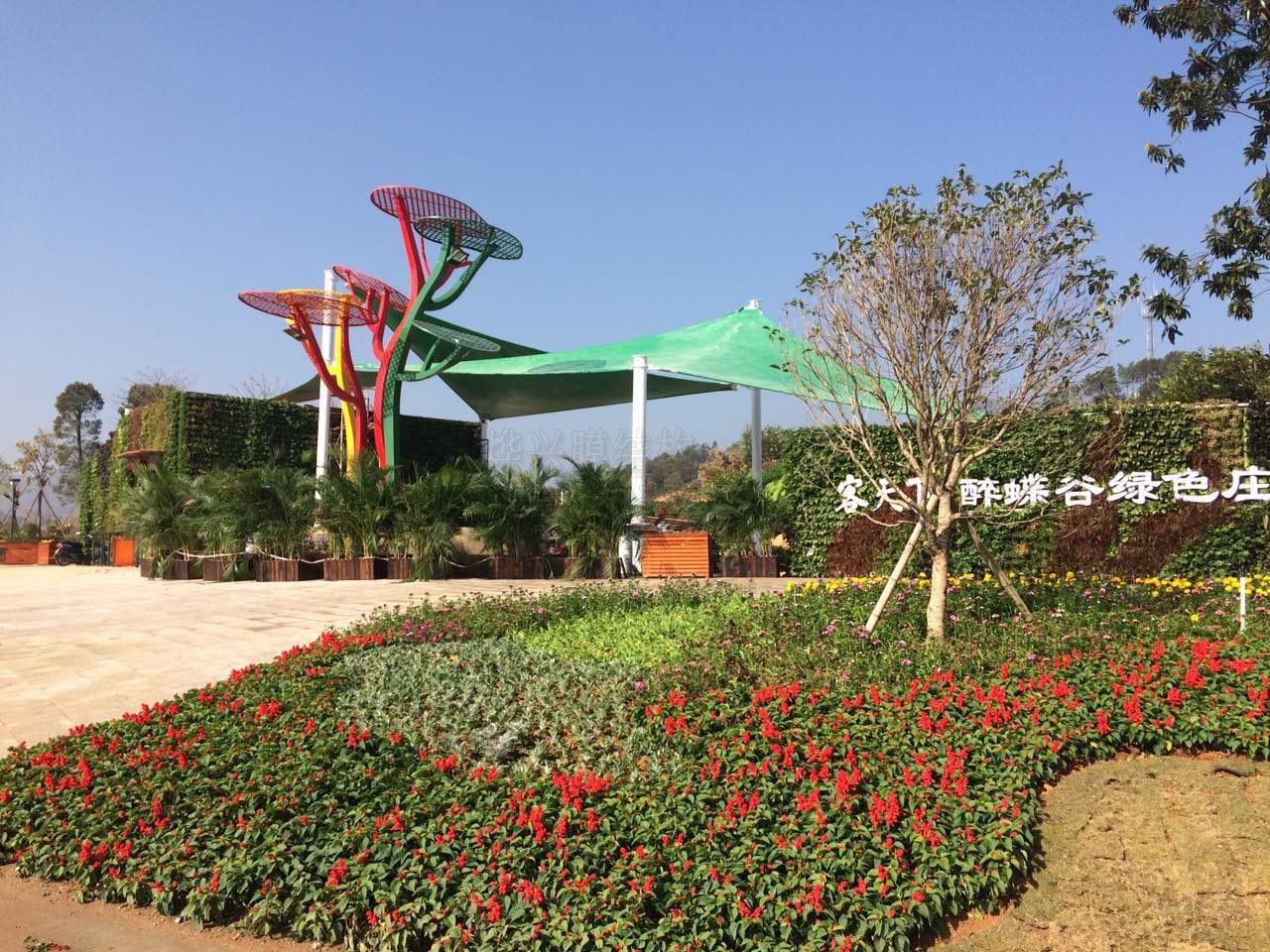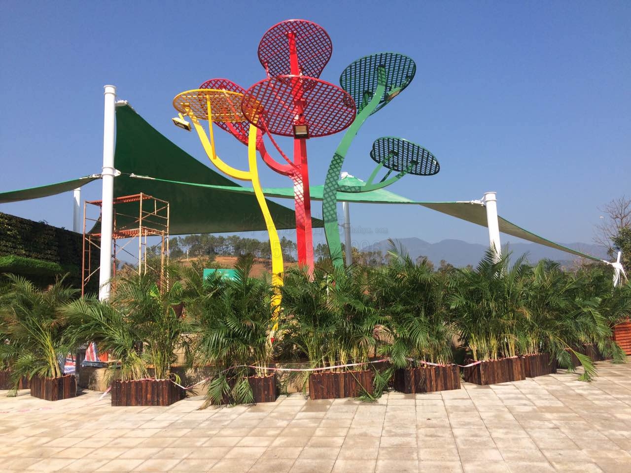 這是典型的景觀膜結(jié)構(gòu),在設(shè)計(jì)師獨(dú)具匠心的設(shè)計(jì)下,幾片綠色的張拉膜配已鋼架做的三色花蕊形狀,呈現(xiàn)在大家眼前的便是一道唯美的風(fēng)景。遠(yuǎn)遠(yuǎn)看去,是不是給人一種賞心悅目的清新感覺(jué)?