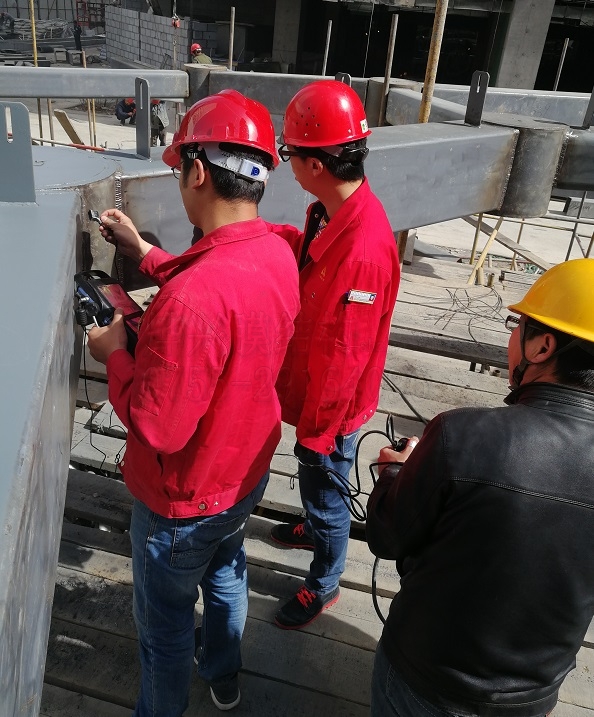 第三方檢測(cè)機(jī)構(gòu)正對(duì)已經(jīng)拼接好的鋼構(gòu)進(jìn)行探傷檢查